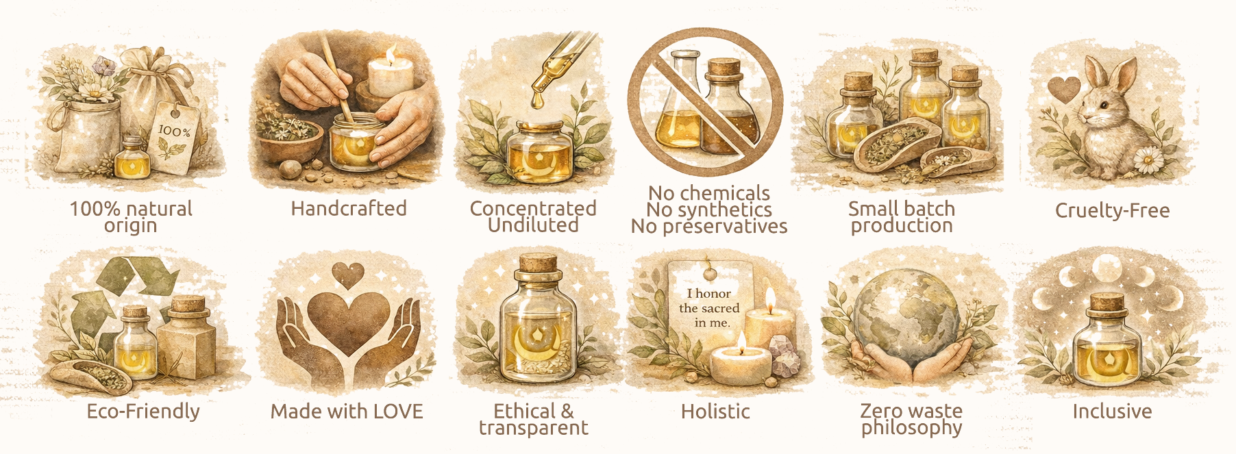 Our care rituals are artisanal, concentrated, ecological, and guided by respect for the body and the Earth - transforming daily gestures into rituals.